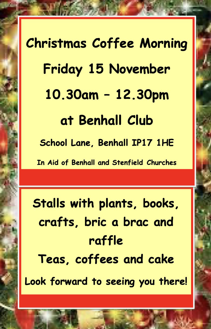 15 November 2024 @ 10:30 am - 12:30 pm Christmas Coffee Morning at Benhall Club Benhall Club Benhall Club, School Lane,, Benhall Green, Suffolk, United Kingdom