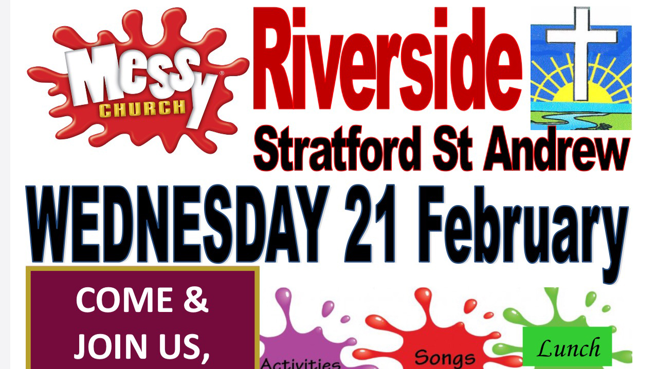 21 February 2024 @ 11:00 am - 1:00 pm Messy Church at The Riverside The Riverside 6 Great Glemham Rd,, Stratford St Andrew, Saxmundham, Suffolk, United Kingdom